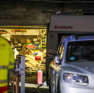 Großer Schreck am Mittwochabend (01.04.2026) für die Besitzer eines Wohnwagens, welche den Wagen für die Abfahrt in den Urlaub am nächsten Morgen bereits komplett gepackt hatten. Aus der Wohnung bemerkten sie Rauch und Flammen aus dem Anhänger und alarmierten umgehend die Feuerwehr, welche zwei Wachen der Berufsfeuerwehr und die Freiwillige Feuerwehr Mangenberg alarmierte.
