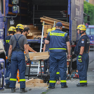 Dieses unterstützte mit einem Baufachberater und weiteren THW-Helfern bei der Abstützung des einsturzgefährdeten Gebäudeteils. Hierzu mussten in aufwendiger Handarbeit Schotter und Baustützen in den betroffenen Bereich verbracht und eingebaut werden. Für die Dauer des Einsatzes war die Schützenstraße im betroffenen Bereich voll gesperrt.